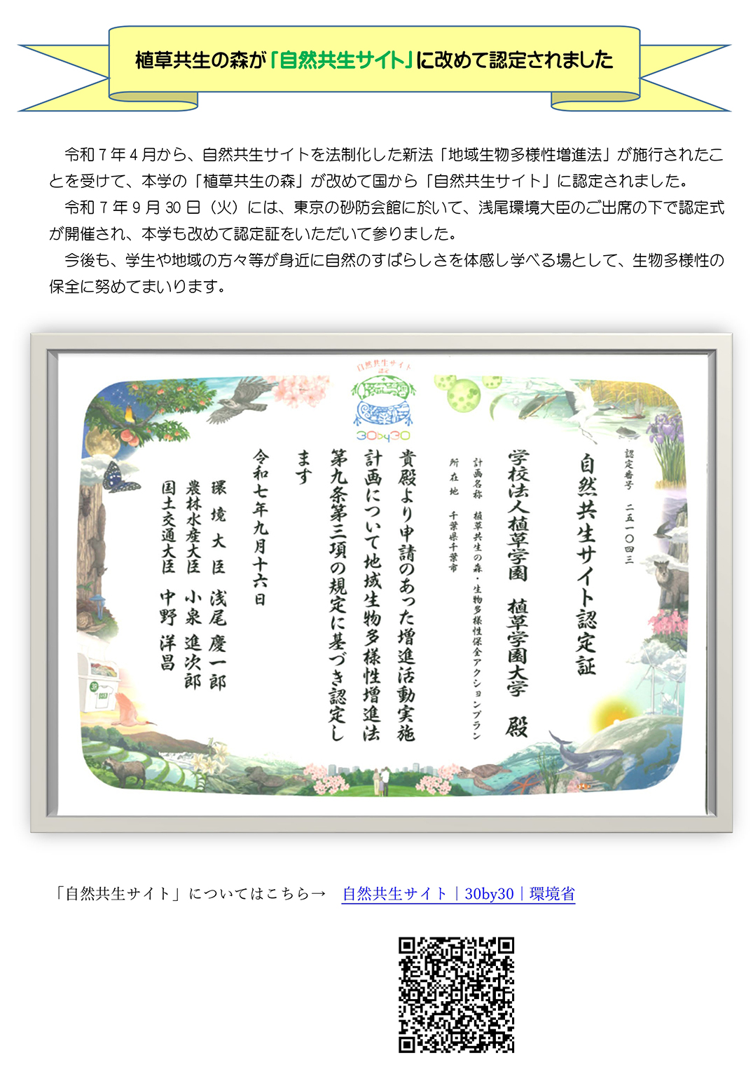 植草共生の森が「自然共生サイト」に改めて認定されました
